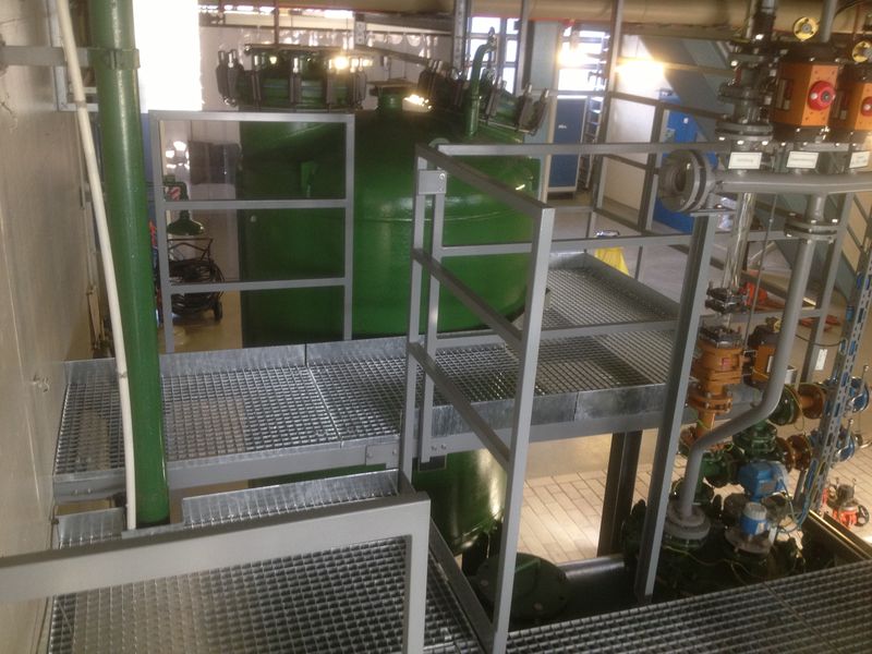 Maschinenpodest in Pharma-Industrie, mit Gitterroste und Industriegeländer