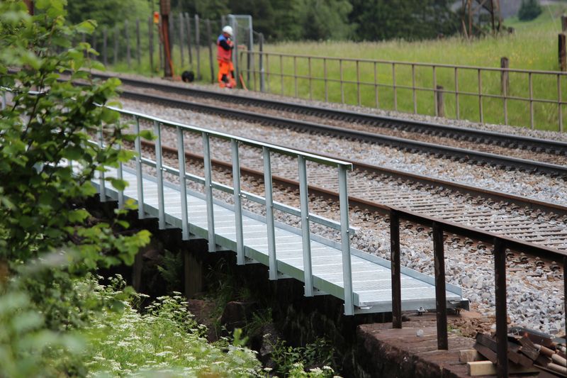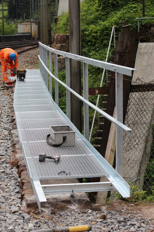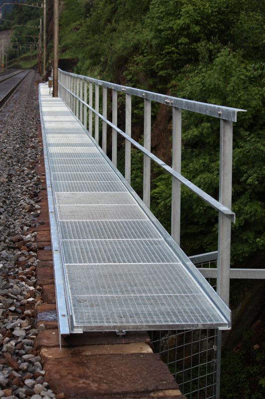 Laufsteg an Bahngeleise mit Gitterroste und Geländer aus Winkeleisen